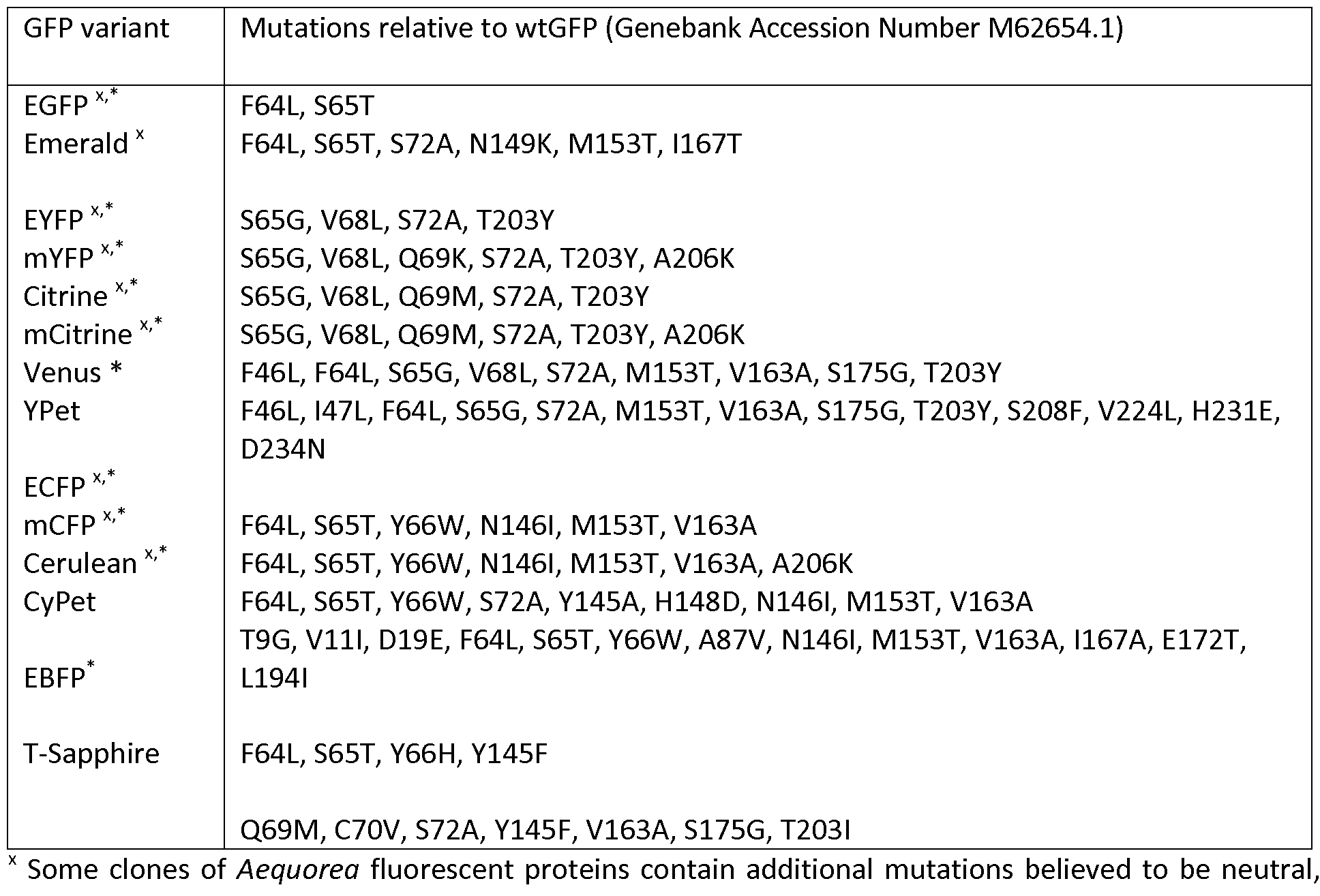 A "mutant" or "variant" or "derivative" (or equivalent wordings having the same meaning), as used herein, and used in the context of an amino acid or nucleotide sequence, is meant to encompass a subsequent amino acid or nucleotide sequence that has been derived from a previous amino acid or nucleotide sequence, or reference sequence, either naturally or artificially. For purposes of illustration only, a variant or mutant protein of wild type Aequorea GFP (the reference in this case) may have one or more amino acid substitutions, additions, or deletions as compared to said Aequorea wild type GFP amino acid sequence. Specific, but non-limiting, examples of fluorescent protein mutants or variants are provided in Tables 5 and 6 (examples known in the art), as well as in the Detailed Description part hereinafter (as part of the present invention). A "spectral variant" or "spectral mutant", as used herein, refers to a fluorescent protein to indicate a mutant fluorescent protein that has a different fluorescence characteristic with respect to the corresponding wild type fluorescent protein. For example, CFP, YFP, ECFP, EYFP-V68L/Q69K, and the like, are GFP spectral variants. A "substitution", as used herein, results from the replacement of one or more amino acids or nucleotides by different amino acids or nucleotides, respectively as compared to an amino acid sequence or nucleotide sequence of a parental or reference polypeptide or nucleic acid. In certain embodiments of the present invention, the substitutions are conservative substitutions. In other embodiments, the substitutions are non-conservative substitutions. Within the context of a protein or polypeptide, conservative and non-conservative amino acid substitutions are known to those of ordinary skill in the art. It is understood that a protein or a fragment thereof may have conservative amino acid substitutions which have substantially no effect on the protein's activity. By conservative substitutions is intended combinations such as gly, ala; val, ile, leu, met; asp, glu; asn, gin; ser, thr; lys, arg; cys, met; and phe, tyr, trp. A "deletion" is defined here as a change in either amino acid or nucleotide sequence in which one or more amino acid or nucleotide residues, respectively, are absent as compared to an amino acid sequence or nucleotide sequence of a parental or reference polypeptide or nucleic acid. Within the context of a protein, a deletion can involve deletion of about 2, about 5, about 10, up to about 20, up to about 30 or up to about 50 or more amino acids. A protein or a fragment thereof may contain more than one deletion. An "insertion" or "addition" is that change in an amino acid or nucleotide sequences which results from the insertion of addition of one or more amino acid or nucleotide residues, respectively, as compared to an amino acid sequence or nucleotide sequence of a parental or reference polypeptide or nucleic