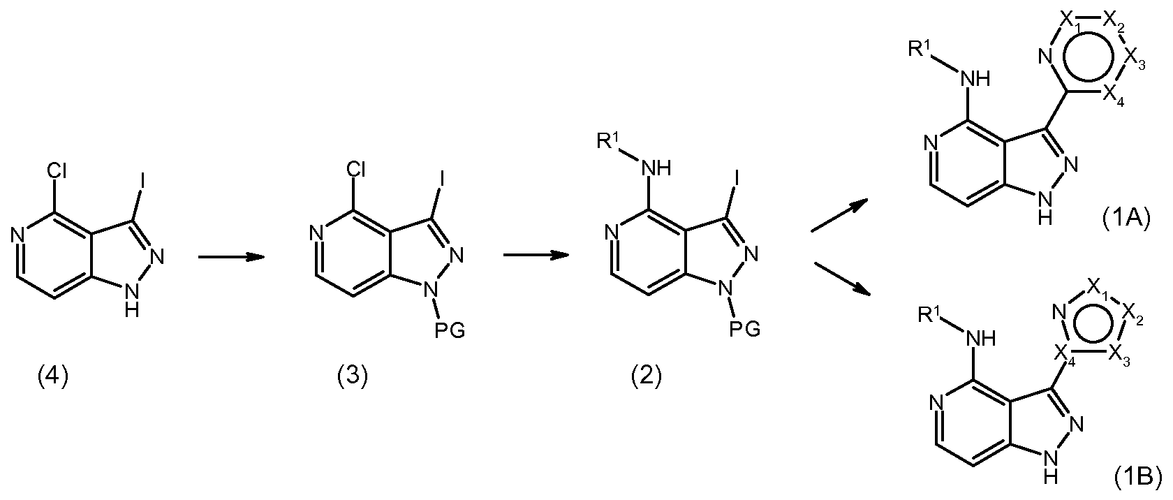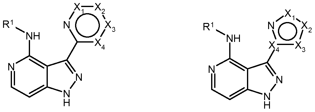Table 1: Structures and Κι (μΜ) values for selected compounds according to the invention 0.0018 1 H-pyrazolo[4,3 -c]pyridin- 4- amine 3- (4-chloropyridin-2-yl)-N- (tetrahydro-2H-pyran-4-yl)- 0.0007 1 H-pyrazolo[4,3 -c]pyridin- 4- amine 3-(4-chloropyridin-2-yl)-N- isopropyl-lH-pyrazolo[4,3- 0.0025 c]pyridin-4-amine 2-(4-(isopropylamino)-lH- pyrazolo [4,3 -c]pyridin-3 - 0.0023 yl)isonicotinonitrile N-isopropyl-3-(4- (trifluoromethyl)- 1 H- pyrazol-l-yl)-lH- 0.0091 pyrazolo[4,3-c]pyridin-4- amine