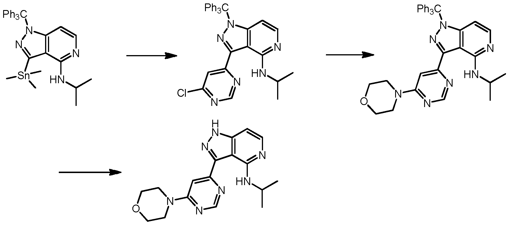 Step 1 - Synthesis of 3-(6-chloropyrimidin-4-yl)-N-isopropyl-l -trityl-lH-pyrazolo[4,3- c]pyridin-4-amine: To a microwave tube was added N-isopropyl-3-(trimethylstannyl)-l- trityl-lH-pyrazolo[4,3-c]pyridin-4-amine (200 mg, 0.344 mmol), 4,6-dichloropyrimidine (102 mg, 0.688 mmol), LiCl (58.0 mg, 1.38 mmol), Cul (13.0 mg, 0.0688 mmol), Pd(PPh3)4 (40.0 mg, 0.0344 mmol) and THF (3.0 mL). After three cycles of vacuum/argon flash, the reaction mixture was heated at 100 °C for 1 hour under microwave irradiation. After cooling down to room temperature, the mixture was filtered via Celite. The filtrate was concentrated under reduced pressure. The residue was purified by prep-TLC eluting with petroleum ether/ethyl acetate (1 :2) to afford the title compound as a yellow solid (80 mg, 44%). Step 2 - Synthesis of N-isopropyl-3-(6-morpholinopyrimidin-4-yl)-l -trityl-lH- pyrazolo[4,3-c]pyridin-4-amine: A mixture of 3-(6-chloropyrimidin-4-yl)-N-isopropyl-l- trityl-lH-pyrazolo[4,3-c]pyridin-4-amine (80.0 mg, 0.151 mmol), morpholine (26.0 mg, 0.302 mmol), and Cs2C03 (98.0 mg, 0.302 mmol) in i-PrOH (10 mL) was refiuxed at 120 °C for 2 h. After filtration, the filtrate was evaporated to afford the title compound as a yellow solid (80 mg, 92%). Step 3 - Synthesis of N-isopropyl-3-(6-mo holinopyrimidin-4-yl)-lH-pyrazolo[4,3- c]pyridin-4-amine: To a mixture of N-isopropyl-3-(6-mo holinopyrimidin-4-yl)-l-trityl- lH-pyrazolo[4,3-c]pyridin-4-amine (80.0 mg, 0.138 mmol) in dichloromethane (5.0 mL) was added trifluoroacetic acid (1.0 mL) and triethylsilane (0.20 mL). The mixture was stirred under reflux for 1 hour. After cooling down, the reaction mixture was neutralized to