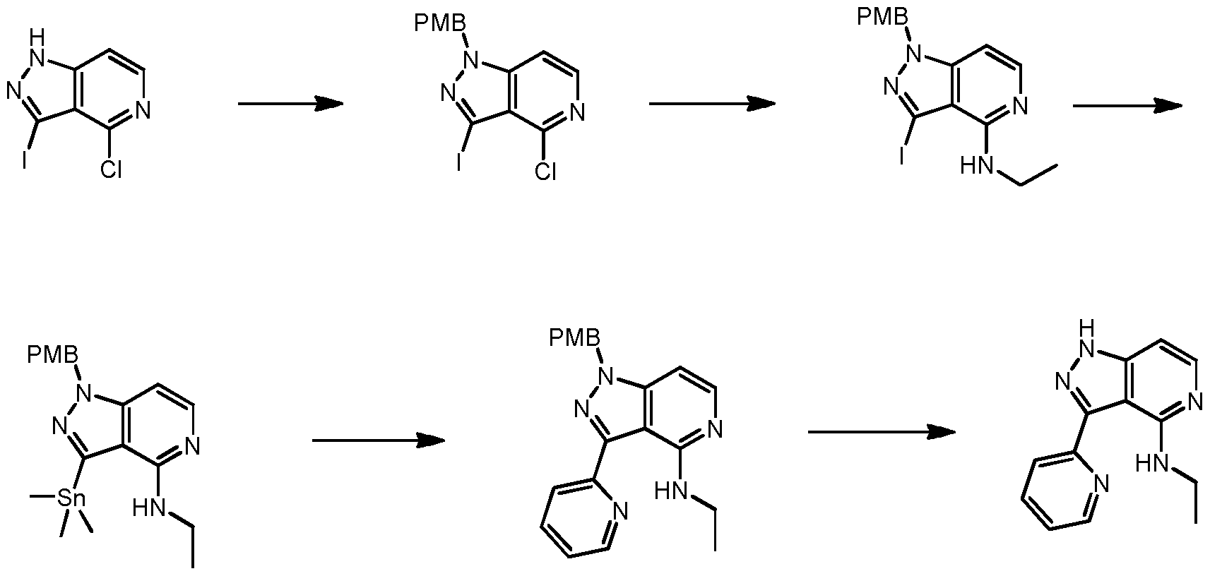 Step 2 - Synthesis of N-ethyl-3-iodo-l-(4-methoxybenzyl)-lH-pyrazolo[4,3- c]pyridin-4-amine: A microwave vial equipped with a magnetic stirrer was charged with 4- chloro-3-iodo-l-(4-methoxybenzyl)-lH-pyrazolo[4,3-c]pyridine (2.00 g, 3.84 mmol), ethanamine (865 mg, 19.2 mmol), and methanol (10 mL). The reaction mixture was heated at 150 °C for 2 h under microwave irradiation. After cooling down, the mixture was concentrated under reduced pressure. The residue was purified by silica gel column chromatography eluting with DCM/petroleum ether/TEA (2/1/0.01) to afford the title compound as a white solid (1.5 g, 73 %). Step 3 - Synthesis of N-ethyl-l-(4-methoxybenzyl)-3-(trimethylstannyl)-lH- pyrazolo[4,3-c]-pyridin-4-amine: A reaction tube equipped with a magnetic stirrer was charged with N-ethyl-3-iodo- 1 -(4-methoxybenzyl)- lH-pyrazolo[4,3-c]pyridin-4-amine (750 mg, 1.84 mmol), 1,1,1,2,2,2-hexamethyldistannane (721 mg, 2.21 mmol), toluene (12 mL), and trans-Pd(PPh3)2Cl2 (39.0 mg, 0.0551 mmol). After three cycles of vacuum/argon flash, the reaction mixture was sealed and heated at 140 °C for 0.5 h. After cooling down to room temperature, the mixture was filtered via Celite. The filtrate was concentrated under reduced pressure to afford the crude title compound, which was used in next step directly without further purification. Step 4 - Synthesis of N-ethyl-l-(4-methoxybenzyl)-3-(pyridin-2-yl)-lH- pyrazolo[4,3-c]pyridin-4-amine: A microwave vial equipped with a magnetic stirrer was charged with N-ethyl-l-(4-methoxybenzyl)-3-(trimethylstannyl)-lH-pyrazolo[4,3- c]pyridin-4-amine (100 mg, 0.225 mmol), 2-bromopyridine (71 mg, 0.45 mmol), LiCl (38 mg, 0.9 mmol), Cul (9.0 mg, 0.045 mmol), Pd(PPh3)4 (26.0 mg, 0.0225 mmol), and THF (3 mL). After three cycles of vacuum/argon flash, the reaction mixture was heated at 100 °C for 1 hour under microwave irradiation. After cooling down to room temperature, the mixture was filtered via Celite. The filtrate was concentrated under reduced pressure. The residue was purified by prep-TLC eluting with petroleum ether/ethyl acetate (1 :2) to afford the title compound as a yellow solid (74 mg, 91%). Step 5 - Synthesis of N-ethyl-3-(pyridin-2-yl)-lH-pyrazolo[4,3-c]pyridin-4-amine: A microwave vial equipped with a magnetic stirrer was charged with N-ethyl-l-(4- methoxybenzyl)-3-(pyridin-2-yl)-lH-pyrazolo[4,3-c]pyridin-4-amine (74.0 mg, 0.206 mmol) and TFA (3.0 mL) . The reaction mixture was heated at 120 °C for 2 h under