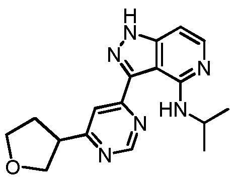 Synthesis of N-isopropyl-3-(4-(tetrahydrofuran-2-yl)pyridin-2-yl)-lH-pyrazolo[4,3- c]pyridine-4-amine: The compound was prepared according to the general procedure described in the synthesis of 3-(4-cyclohexylpyridin-2-yl)-N-isopropyl-lH-pyrazolo[4,3- c]pyridin-4-amine by reacting 3-(4-chloropyridin-2-yl)-N-isopropyl-l-(4-methoxybenzyl)- lH-pyrazolo[4,3-c]pyridin-4-amine with 2-(4,5-dihydrofuran-2-yl)-4,4,5,5-tetramethyl- 1,3,2-dioxaborolane to give the title compound as a yellow solid (15 mg, 27% yield over three steps). 1H NMR (500 MHz, CDC13) δ 8.48 (d, J= 5.0 Hz, 1H), 8.32 (s, 1H), 7.84 (d, J = 4.5 Hz, 1H), 7.35 (d, J = 5.0 Hz, 1H), 6.65 (s, 1H), 5.00 (t, J = 7.0 Hz, 1H), 4.49 (s, 1H), 4.16 - 4.12 (m, 1H), 4.03 - 4.00 (m, 1H), 2.48 - 2.44 (m, 1H), 2.06 - 2.02 (m, 2H), 1.86 - 1.81 (m, 2H), 1.43 (d, J= 6.0 Hz, 6H). N-isopropyl-3-(4-(l-methylpiperidin-4-yl)pyridin-2-yl)-lH-pyrazolo[4 - c] py ridin-4-amine 3-(6-cyclohexylpyrimidin-4-yl)-ALisopropyl-lH-pyrazolo[4,3-c]pyridin-4-amine Step 4 - Synthesis of 3-(6-cyclohexylpyrimidin-4-yl)-N-isopropyl-lH-pyrazolo[4,3- c]pyridin-4-amine: A microwave vial equipped with a magnetic stirrer was charged with 3- (6-cyclohexylpyrimidin-4-yl)-N-isopropyl-l-(4-methoxybenzyl)-lH-pyrazolo[4,3- c]pyridin-4-amine (50 mg, 0.1 1 mmol) and TFA (0.5 mL). The reaction mixture was heated at 150 °C for 30 min under microwave irradiation. After cooling down, the mixture was concentrated under reduced pressure. The residue was purified by reverse-phase prep- HPLC to afford the title compound as a yellow solid (13.8 mg, 72%). 1H NMR (500 MHz, CD3OD) δ 9.09 (d, J = 1.5 Hz, 1H), 8.25 (d, J = 1.0 Hz, 1H), 7.65 (d, J = 7.0 Hz, 1H), 6.66 (d, J = 7.5 Hz, 1H), 4.21 - 4.18 (m, 1H), 4.09 - 4.04 (m, 2H), 3.62 - 3.56 (m, 2H), 3.30 - 3.28 (m, 2H), 3.05 -3.02 (m, 1H), 1.96 - 1.91 (m, 4H), 1.36 (d, J = 8.5 Hz, 6H). ALisopropyl-3-(6-(tetrahydrofuran-3-yl)pyrimidin-4-yl)-lH-pyrazolo[4,3- c] py ridin-4-amine ALisopropyl-3-(6-(tetrahydrofuran-2-yl)pyrimidin-4-yl)-lH-pyrazolo[4,3- c] py ridin-4-amine Synthesis of N-isopropyl-3 -(6-(tetrahydrofuran-2-yl)pyrimidin-4-yl)- 1H- pyrazolo[4,3-c]pyridin-4-amine: The compound was prepared according to the general procedure described in the synthesis of 3-(6-cyclohexylpyrimidin-4-yl)-N-isopropyl-lH- pyrazolo[4,3-c]pyridin-4-amine by reacting 3-(6-chloropyrimidin-4-yl)-N-isopropyl-l-(4- methoxybenzyl)-lH-pyrazolo[4,3-c]pyridin-4-amine with 2-(4,5-dihydrofuran-2-yl)- 4,4,5,5-tetramethyl-l ,3,2-dioxaborolane to give the title compound as a yellow solid (4.1 mg, 2.6% yield over three steps).!H NMR (500 MHz, CD3OD) δ 9.1 (d, J = 1.5 Hz, 1H), 8.45 (s, 1H), 7.68 (s, 1H), 6.67 (d, J = 6.0 Hz, 1H), 5.02 - 4.99 (m, 1H), 4.22 - 4.16 (m, 2H), 4.03 - 4.02 (m, 1H), 2.53 - 2.51 (m, 1H), 2.06 - 1.99 (m, 3H), 1.38 (d, J = 6.0 Hz, 6H). 2-(4-(isopropylamino)-lH-pyrazolo[4,3-c]pyridin-3-yl)-N,N- dimethy liso nicotinamide