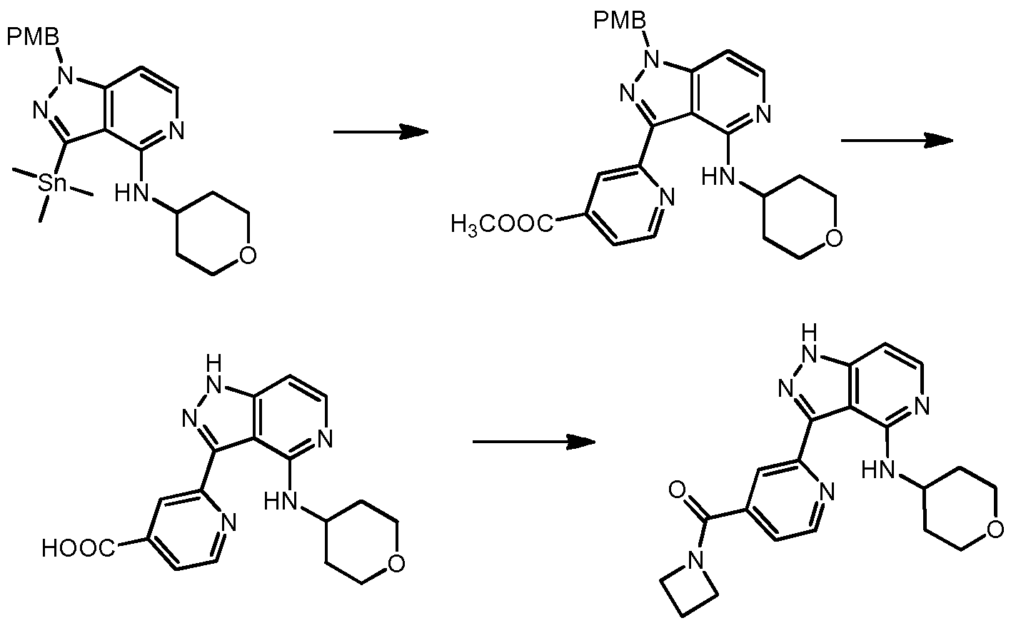 Step 1 - Synthesis of methyl 2-(l-(4-methoxybenzyl) -4-(tetrahydro-2H- pyran-4- ylamino)-lH-pyrazolo[4,3-c]pyridin-3-yl)isonicotinate: A microwave vial equipped with a magnetic stirrer was charged with l-(4-methoxybenzyl)-N-(tetrahydro-2H-pyran-4-yl)-3- (trimethylstannyl)-lH-pyrazolo[4,3-c]pyridin-4-amine (200 mg, 0.399 mmol), methyl 2- bromoisonicotinate (172 mg, 0.798 mmol), LiCl (67 mg, 1.6 mmol), Cul (7.6 mg, 0.040 mmol), Pd(PPh3)4 (46 mg, 0.040 mmol), and THF (10 mL). After three cycles of vacuum/argon flash, the reaction mixture was heated at 100 °C for 1 h under microwave irradiation. After cooling down, the mixture was concentrated under reduced pressure. The residue was purified by prep-TLC eluting with petroleum ether/ethyl acetate (2: 1) to afford the title compound as a yellow solid (86 mg, 46%). Step 2 - Synthesis of 2-(4-(tetrahydro-2H-pyran-4-ylamino)-lH-pyrazolo[4,3- c]pyridin-3-yl)isonicotinic acid: A microwave vial equipped with a magnetic stirrer was charged with methyl 2-(l-(4-methoxybenzyl)-4-(tetrahydro-2H-pyran-4-ylamino)-lH- pyrazolo[4,3-c]pyridin-3-yl)isonicotinate (86.0 mg, 0.181 mmol) and TFA (12 mL). The reaction mixture was heated at 150 °C for 2 h under microwave irradiation. After cooling down, the mixture was concentrated under reduced pressure. The residue was purified by reverse-phase prep-HPLC to afford the title compound as a green solid (50 mg, 81%). Step 3 - Synthesis of azetidin-l-yl(2-(4-(tetrahydro-2H-pyran-4-ylamino)-lH- pyrazolo[4,3-c]pyridin-3-yl)pyridin-4-yl) methanone: To a 25-mL round bottom flash was