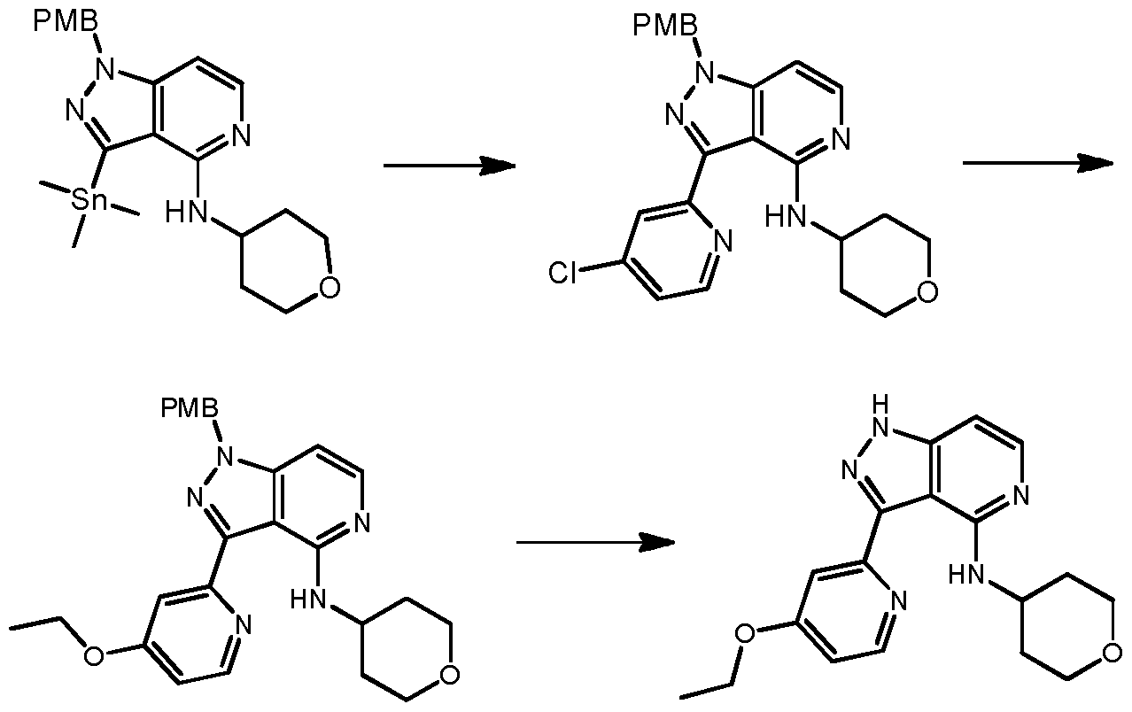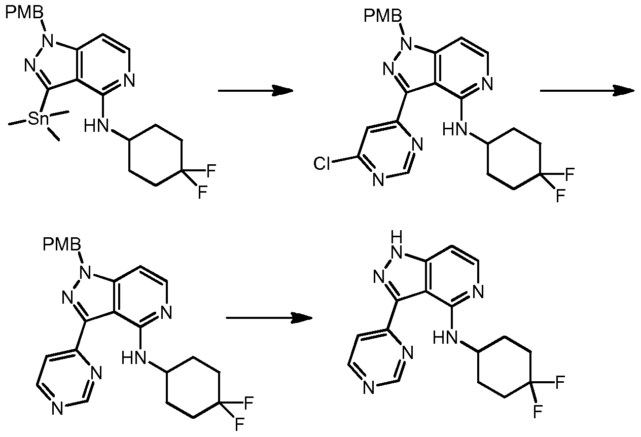 Step 1 - Synthesis of N-(4,4-difluorocyclohexyl)-3-iodo-l-(4-methoxybenzyl)-lH- pyrazolo[4,3-c]pyridin-4-amine: A microwave vial equipped with a magnetic stirrer was charged with 4-chloro-3-iodo-l-(4-methoxybenzyl)-lH-pyrazolo[4,3-c]pyridine (400 mg, 1.00 mmol), 4,4-difluorocyclohexanamine hydrochloride (342 mg, 2.00 mmol), DIPEA (336 mg, 3.00 mmol), and n-BuOH (10 mL). The reaction mixture was heated at 170 °C for 2 h under microwave irradiation. After cooling down, the mixture was concentrated under reduced pressure. The residue was purified by silica gel column chromatography eluting with DCM/petroleum ether/TEA (2:1 :0.01) to afford the title compound as a grey solid (310 mg, 62%). Step 2 - Synthesis of N-(4,4-difluorocyclohexyl)-l-(4-methoxybenzyl)-3- (trimethylstannyl)-lH-pyrazolo[4,3-c]pyridin-4-amine: A reaction tube equipped with a magnetic stirrer was charged with N-(4,4-difluorocyclohexyl)-3-iodo-l-(4- methoxybenzyl)-lH-pyrazolo[4,3-c]pyridin-4-amine (240 mg, 0.482 mmol), 1,1,1,2,2,2- hexamethyldistannane (315 mg, 0.946 mmol), toluene (12 mL), and trans-Pd(PPri3)2Cl2 (8.5 mg, 0.012 mmol). After three cycles of vacuum/argon flash, the reaction mixture was sealed and heated at 110 °C for 15 h. After cooling down, the mixture was filtered. The filtrate was concentrated under reduced pressure to give the title compound, which was used in the next step without further purification (285 mg, over 100%).
