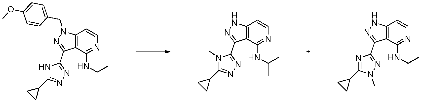 procedure described in the synthesis of N-isopropyl-3-(pyridin-2-yl)-lH-pyrazolo[4,3- c]pyridin-4-amine to give the title compound. N-isopropyl-3-(4-(isopropylsulfonyl)pyridin-2-yl)-lH-pyrazolo[4,3-c]pyridin-4- amine Synthesis ofN-isopropyl-3-(4-(isopropylsulfonyl)pyridin-2-yl)-lH-pyrazolo[4,3- c]pyridin-4-amine: The compound was prepared according to the general procedure described in the synthesis of N-isopropyl-3-(pyridin-2-yl)-lH-pyrazolo[4,3-c]pyridin-4- amine to give the title compound. 3-(5-cyclopropyl-4-methyl-4H-l,2,4-triazol-3-yl)-N-isopropyl-lH-pyrazolo[4,3- c]pyridin-4-amine and 3-(5-cyclopropyl-l-methyl-lH-l,2,4-triazol-3-yl)-N-isopropyl- 1 H-py razolo [4,3-c] pyridin-4-amine Synthesis of 3-(5-cyclopropyl-4-methyl-4H-l,2,4-triazol-3-yl)-N-isopropyl-lH- pyrazolo[4,3-c]pyridin-4-amine and 3-(5-cyclopropyl-l-methyl-lH-l ,2,4-triazol-3-yl)-N- isopropyl-lH-pyrazolo[4,3-c]pyridin-4-amine: To a vial was added 3-(5-cyclopropyl-4H- l,2,4-triazol-3-yl)-N-isopropyl-l-(4-methoxybenzyl)-lH-pyrazolo[4,3-c]pyridin-4-amine (48.5 mg; 0.120 mmol), cesium carbonate (58.7 mg; 0.180 mmol) and dimethylformamide (1.8 mL, 22.8 mmol). lodomethane, (0.011 mL, 0.180 mmol) was added, the vial was capped and the reaction was heated to 90 °C for 2 h. The reaction mixture was diluted with DCM and water and the layers were separated. The aqueous layer was extracted with DCM