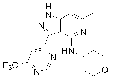 mixture was heated at 120 °C for 2 h under microwave irradiation. After cooling down, the mixture was concentrated under reduced pressure. The residue was purified by reverse- phase prep-HPLC to afford the title compound as a yellow solid (18 mg, 27%).!H NMR (500 MHz, CD3OD) δ 9.22 (d, J = 1.0 Hz, 1H), 8.86 (d, J = 6.0 Hz, 1H), 8.42 (d, J = 3.5 Hz, 1H), 7.76 (d, J= 6.0 Hz, 1H), 6.73 (d, J = 6.0 Hz, 1H), 4.17 - 4.15 (m, 1H), 2.26 - 2.21 (m, 2H), 2.19 - 2.09 (m, 2H), 1.87 - 1.62 (m, 2H), 1.84 - 1.81 (m, 2H). 3-(6-methyl-4-(trifluoromethyl)pyridin-2-yl)-N-(tetrahydro-2H-pyran-4-yl)-lH- pyrazolo[4,3-c]pyridin-4-amine Synthesis of 3-(6-methyl-4-(trifluoromethyl)pyridin-2-yl)-N-(tetrahydro-2H-pyran-4- yl)-lH-pyrazolo[4,3-c]pyridin-4-amine: The compound was prepared according to the general procedure described in the synthesis of N-isopropyl-3-(pyridin-2-yl)-lH- pyrazolo[4,3-c]pyridin-4-amine to give the title compound. 3-(2-methyl-6-(trifluoromethyl)pyrimidin-4-yl)-N-(tetrahydro-2H-pyran-4-yl)- 1 H-py razolo [4,3-c] pyridin-4-amine Synthesis of 3-(2-methyl-6-(trifluoromethyl)pyrimidin-4-yl)-N-(tetrahydro-2H- pyran-4-yl)-lH-pyrazolo[4,3-c]pyridin-4-amine: The compound was prepared according to the general procedure described in the synthesis of N-isopropyl-3-(pyridin-2-yl)-lH- pyrazolo[4,3-c]pyridin-4-amine to give the title compound.