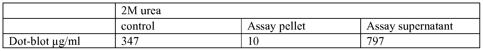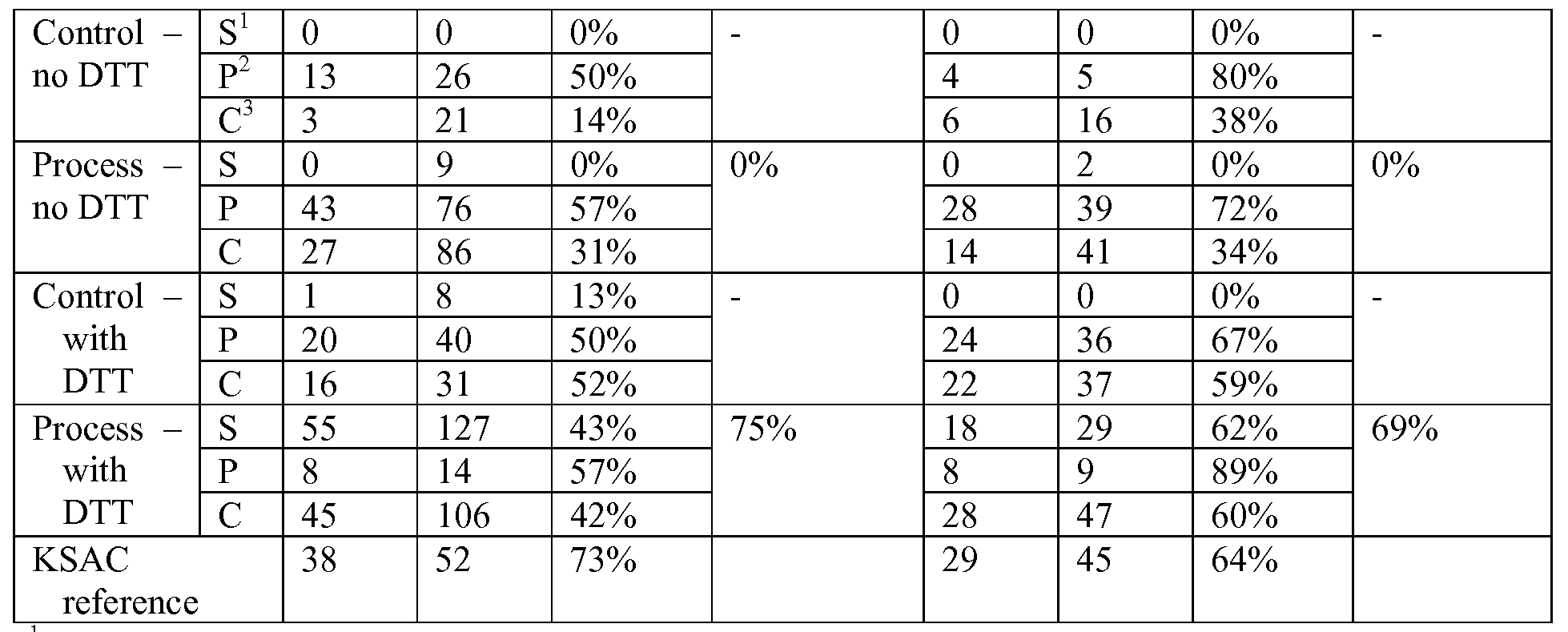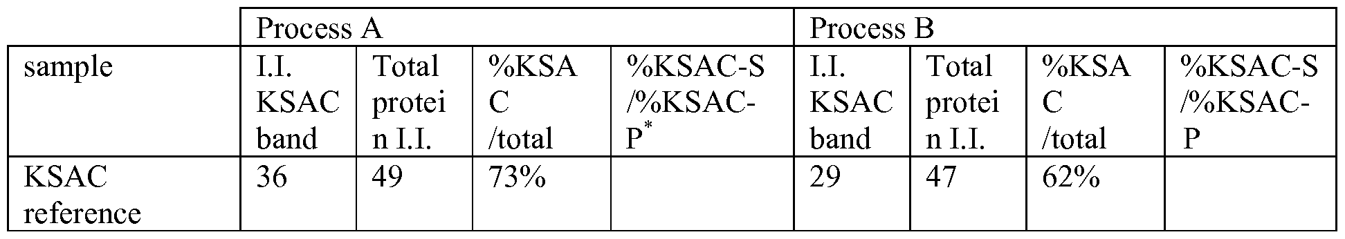 [0101] No significant difference was observed between the control samples (no high pressure treatment) with and without DTT. There was no soluble KSAC found in the supernatant. The Q-Dot Blot result confirmed the SDS-PAGE result.