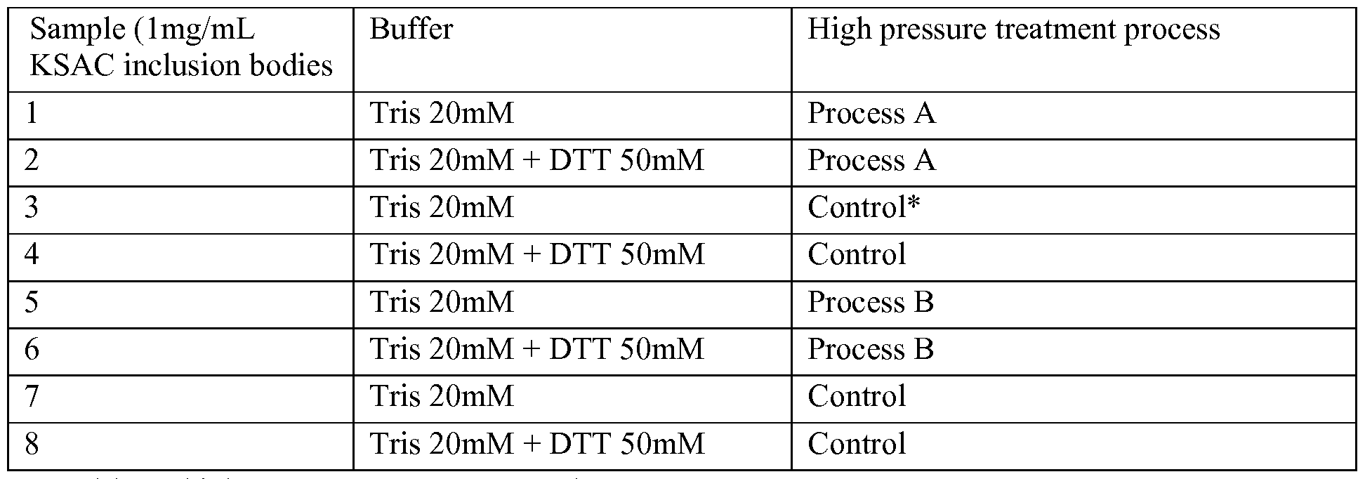 buffer, pH=8.0. The inclusion bodies suspensions were stored in Quick Seal tubes for high pressure treatments as described below. In process A, stepwise pressurization was applied to the inclusion bodies suspensions increasing the pressure from 0 bar to 3000 bar at 1000 bar/min, with a plateau of 1 hour duration at each 500 bar (target pressure of 3000 bar reached after 5 hr). The 3000 bar pressure was maintained for 48 hours. The samples were then depressurized from 3000 bar to 0 bar at constant rate of 125 bar/hr for 24 hrs. In process B, the inclusions bodies suspensions were treated according to the method described in US 6,489,450. The samples were subject to pressurization at constant rate up to 2500 bar in 1 hr. The 2500 bar pressure was maintained for 6 hrs. Depressurization was performed at constant rate for 1 hr reducing the pressure from 2500 bar to 0 bar. Samples were prepared as shown in Table 7 below. Table 7. Inclusion bodies suspensions treatment Control *: no high pressure treatment, stored at room temperature. SDS-PAGE Analysis After the high pressure treatments, the samples were centrifuged to separate the supernatant and pellets, and processed for protein analysis on SDS-PAGE. The SDS-PAGE analysis is shown in Figures 18A and 18B. Each well was loaded with either 5 μΐ of sample (crude), 5 μΐ of supernatant, 5 μΐ of pellet resuspended in Tris buffer. The KSAC protein amounts calculated from the band intensity on the SDS-PAGE were presented in Table 8 below. Table 8. Comparative integration of the intensities of the bands measured on SDS S1: supernatant P2: pellet C3: crude, before centrifugation %KSAC-S/%KSAC-P*: [%KSAC/total in supernatant] / [%KSAC total in pellet] The results show that there is no significant amount of KSAC detected in the supernatant of the controls or the samples treated with processes A and B when buffer containing no DTT was used. Soluble KSAC protein was found in the supernatant of the samples treated with high pressure (both processes A and B) when buffer containing DTT was used. Surprisingly, the results of protein quantification from SAS-PAGE also indicate that process A provided better solubilization when compared to process B. This surprising result was further confirmed by the more accurate calculation of the solubilization yield for each high pressure process using Q-Dot Blot and HPLC. Q-Dot Blot Analysis The supernatants of the samples were analyzed by Q-Dot Blot to estimate the amount of KSAC protein solubilized by the treatments. The results are shown in FIGs. 30A-30D and Table 1 1. Table 1 1. Concentrations of solubilized KSAC found in the supernatants for controls and high pressure processed samples [0102] The treatment performed using process A with DTT allowed solubilizing and refolding of the KSAC protein (detected by Q-Dot Blot). The concentration of soluble KSAC protein was found to be 632 μg/mL using process A while concentration of KSAC protein obtained using the process B was only about 369 g/mL. The solubilization yields obtained are 63% for process A and 37% for process B. The Q- Dot Blot results further demonstrate that process A is more efficient in producing soluble and refolded proteins. HPLC Analysis [0103] Figure 20 shows the superposition of the HPLC chromatograms of the supernatant of the control and process A treated sample. The retention time, retention volume and estimated purity obtained for the process A treated sample are show in Table 1 1 below. Table 1 1 Retention time, retention volume and estimated purity obtained for process A treated sample [0104] Figure 21 shows the superposition of the HPLC chromatograms of the supernatant of process A treated sample and process B treated sample. The retention time, retention volume and estimated purity obtained for the process A treated sample are show in Table 12 below. Table 12 Retention time, retention volume and estimated purity obtained for process A and B treated samples Figure 22 shows the superposition of the HPLC chromatograms of the supernatant of process A treated sample, process B treated sample and classical process treated sample (denaturation and refolding obtained by urea and DTT treatment). The retention time, retention volume and estimated purity obtained for the process A treated sample are show in Table 13 below. Table 13 Retention time, retention volume and estimated purity obtained for process A, process B and classical process treated samples The HPLC results further confirmed that process A provided better solubilization of KSAC protein than process B judging from the peak areas (2525 ImAu for process A vs. 10506mAU for process B). Both process A and B allow obtaining a refolding of the KSAC protein very close to the one obtained using the classical process (solubilization using urea + DTT treatment and refolding by SEC chromatography). The trials performed with both processes A and B did not yield significant soluble KSAC protein in the absence of DTT. The results confirmed that a reducing agent is needed during the high pressure treatment to break disulfide bonds. However, the unexpected surprising discovery is that there is no need for the removal of DTT in order to obtain a correct refolding of the protein. Contrary to the general knowledge that DTT has to be removed from the buffer in order for proteins to be refolded properly, it is surprisingly discovered by applicants that presence of DTT does not interfere with the refolding process in the high pressure treatment of present invention. The KSAC soluble proteins obtained from high pressure process of present invention were refolded correctly to form trimmers in the presence of DTT. References. C. Silva et al: Effect of hydrostatic pressure on the Leptospira interrogans: high immunogenicity of the pressure-inactivated serovar hardjo; Vaccine 19, 2001, 151 1-1514.