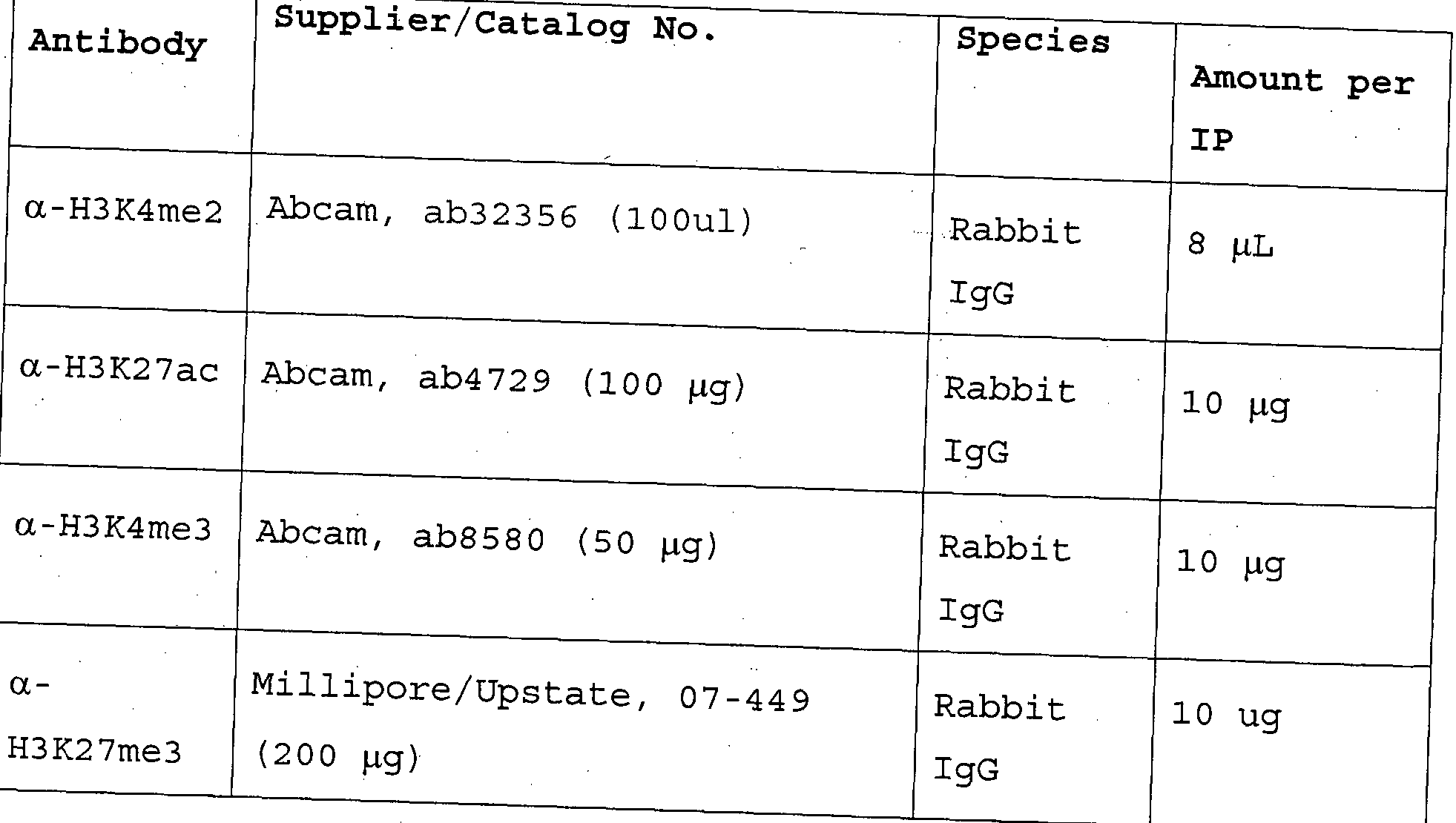 NaCl) to yield an effective -0.1% SDS concentration for immunoprecipitation, centrifuged (13,200 rpm, 10 mins) to remove cellular debris, and pre-cleared overnight with Protein G Dynabeads (Invitrogen) . [00243] Concurrently, for each individual chIP, 100 μΐ· of Protein G Dynabeads was washed twice (PBS + 0.1% Triton X- 100) , complexed with ChlP-qualified antibody (Table 4) overnight at 4 °C, and washed thrice more to yield antibody- bead complexes. Antibody-bead complexes were added to pre- cleared chromatin. [00244] Table 4: List of antibodies for chromatin immunoprecipitation. [00245] After overnight immunoprecipitation (4 °C) , antigen- antibody-bead complexes were washed twice respectively in low salt wash buffer (0.1% SDS, 1% Triton X-100, 2mM EDTA, 20m Tris pH 8.0, 150mM NaCl) , high salt wash buffer (0.1% SDS, 1% Triton X-100, 2mM EDTA, 20mM Tris pH 8.0, 500mM NaCl), LiCl■wash buffer (10 mM Tris pH 8.0, Im EDTA, 0.25M LiCl, 1% Nonidet P-40) , and finally, TE buffer. Antibodies were eluted from beads and formaldehyde cross-linking was reversed overnight by mild heating (65 DC), and chromatin was sequentially treated with RNase and Proteinase K before final column purification. The final concentration of immunoprecipitated chromatin was quantified by PicoGreen (Invitrogen) . [00246] Illumina sequencing libraries were generated using the TruSeq ChIP Sample Preparation Kit (Illumina) . Briefly, 10 ng of ChlP-enriched DNA was end-repaired, 3' adenylated, ligated with Illumina adapters, and amplified through 15 cycles of PCR amplification with Phusion High Fidelity DNA polymerase (Finnzymes) with primers directed against the adapters. After library constructed was completed, insert size was re-verified by on-chip electrophoresis (Agilent Bioanalyzer) and readable fragments were quantified by qPCR with primers directed against the adapters. High- throughput sequencing was conducted on the Hi-Seq 2000 (Illumina) by the Genome Institute of Singapore' s Solexa Group for 1 x 36+7 cycles (single read, 36bp of insert of a multiplexed library, 7bp for adapter barcode identification) . Sequenced reads were mapped to the hgl9 human reference genome using Bowtie (Langmead et al . , 2009), allowing up to 3 bp mismatches and discarding reads mapping to more than 1 genomic locus. Each aligned fragment was extended by 200 bp and input- normalization was performed using MACS (Zhang et al . , 2008). Histone peak visualization was performed using the Integrative Genomics Viewer from the Broad Institute (Thorvaldsdottir et al . , 2012). Library sequencing statistics are provided in Fig. 20. Assigning and analyzing enhancers during ChlP-seq analysis