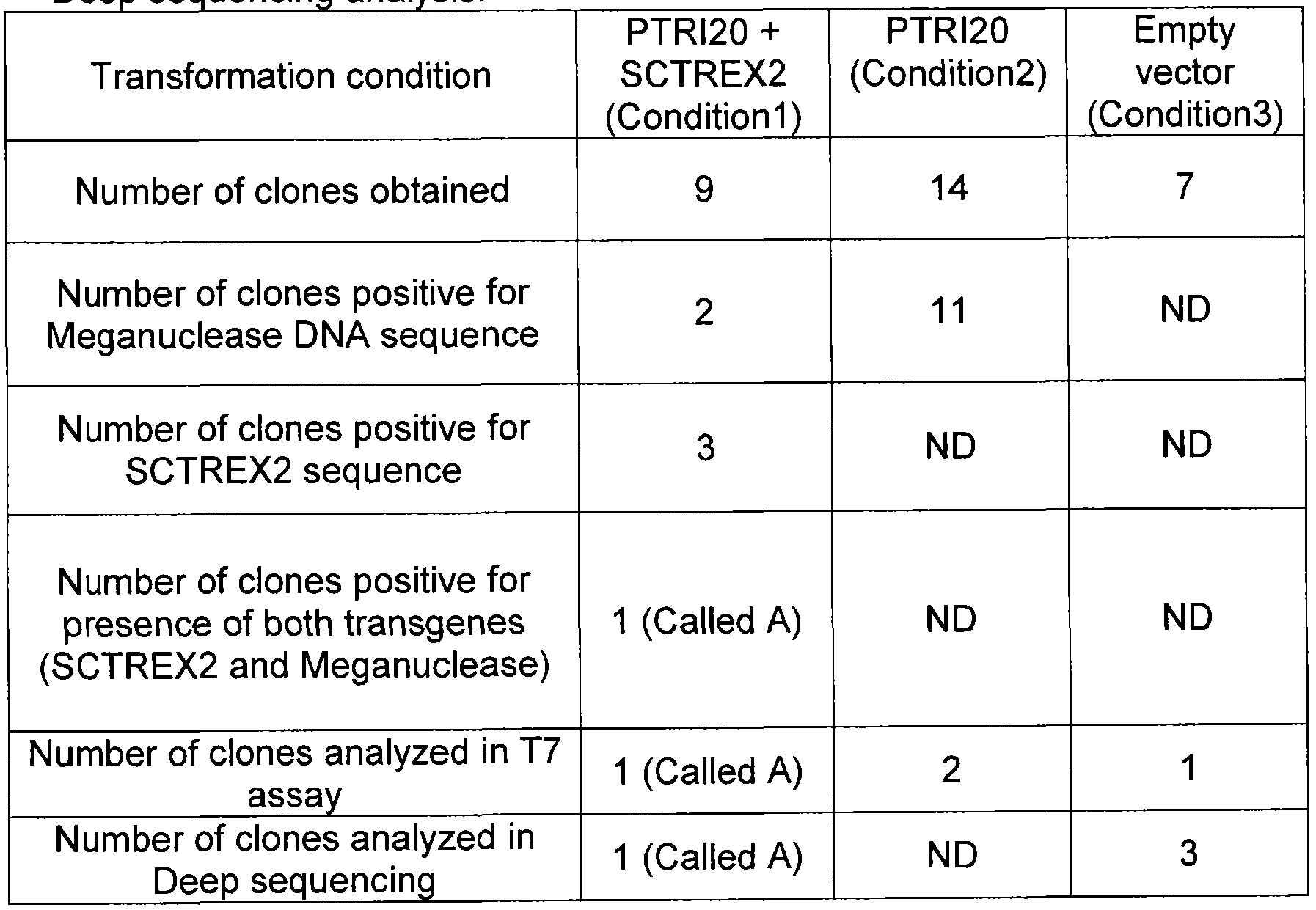 Table2: Number of clones obtained after transformation, number of clones that have integrated the PTRI020 meganuclease and SCTREX2 DNA sequences and the number of clones tested in the T7 assay and Example 3: High targeted mutagenesis frequency at diatom endogenous locus using the combination SCTREX2 and PTRI02 meganuclease. To investigate the ability of the DNA processing enzyme SCTREX2 to increase the targeted mutagenesis frequency induced by a meganuclease, one engineered meganuclease, called PTRI02 encoded by the pCLS17181 plasmid (SEQ ID NO: 12) designed to cleave the DNA sequence 5' - TTTTGACGTCGTACGGTGTCTCCG- 3' (SEQ ID NO: 13) was used. This meganuclease encoding plasmid was co-transformed with plasmid encoding selection gene (Natl) (SEQ ID NO: 3) and with a plasmid encoding the DNA processing enzyme, SCTREX2 encoded by the pCLS18296 (SEQ ID NO: 7). The mutagenesis rate was measured by Deep sequencing on individual clones resulting from transformations.
