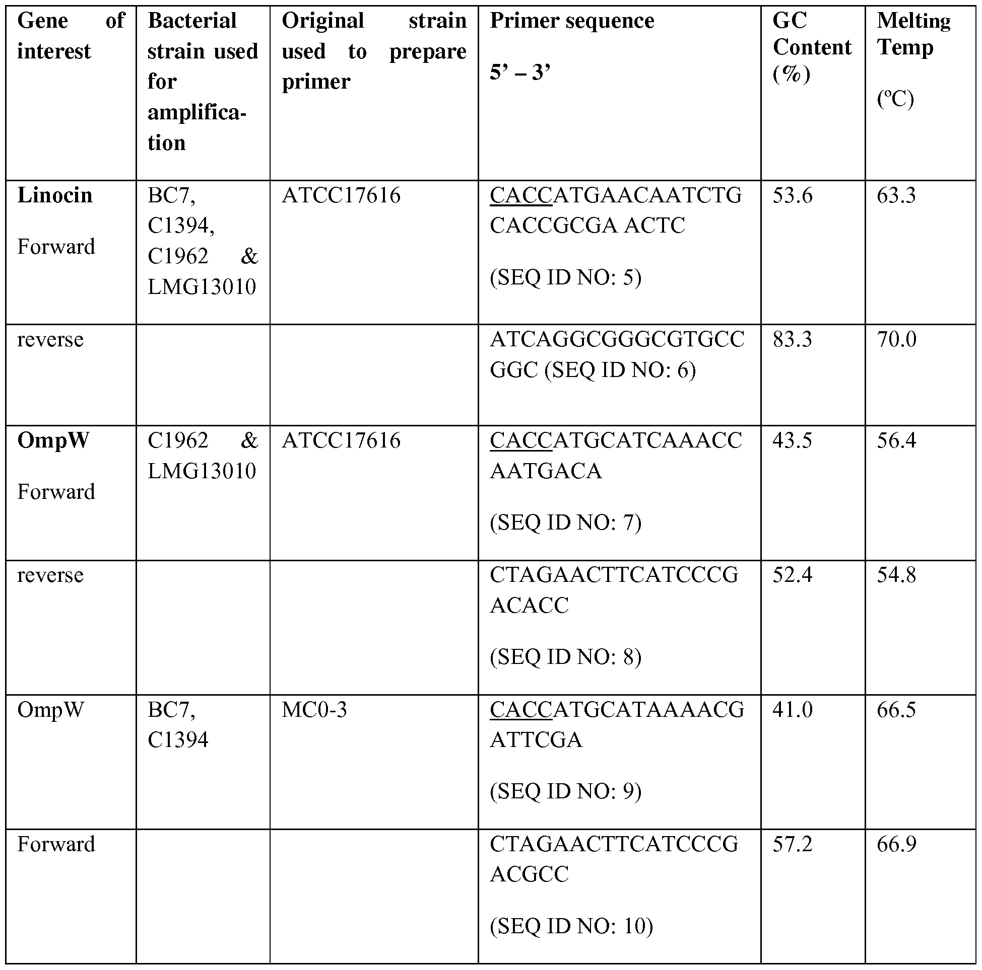 without further extraction of the gel pieces [20]. MALDI analysis was performed using a Bruker Ultraflex MALDI-ToF (Bruker Daltonics) with ground steel target plate. An equal volume of (1 :1) peptide extracts and matrix solution (2 mg/ml a-cyano-4-hydroxycinnamic acid (CHCA) in 70 % of 0.1 % TFA and 30 % of acetonitrile) were applied on to the target plate along with peptide calibration standards and BSA as a control and then all samples were allowed to dry. Peptide Mass Fingerprinting (PMF) was used for protein identification and the spectra were analysed in Flex Analysis and Bio Tools software from Bruker. Peak lists were then submitted to the MASCOT (http://www.matrixscience.com) search engine for analysis. Protein sequence database searching was performed on the NCBInr database. The following general search parameters were used: monoisotopic molecular masses, enzyme specificity trypsin, all species allowed, variable modification was methionine oxidation and global modification was carbamidomethyl cysteine alkylation, with a mass tolerance of 100 ppm. Cloning and Expression of membrane proteins: Genomic DNA was isolated using the ® DNeasy Blood & Tissue kit from Qiagen. The specific primers were designed according to Linocin and OmpW sequences of B. multivorans strain, ATCC 17616, and B. cenocepacia strain, MCO-3, from NCBI. To enable the directional cloning the forward primers contained CACC sequence at the 5' end. The sequences of the forward and reverse primers for amplification are shown in Table 1. PCR amplification was carried out with Hot start high- fidelity PCR kit from Qiagen using the following thermal cycle programme: initial activation for 5 min at 95 °C, followed by 35 cycles consisting of denaturation at 94 °C for 30 sec, annealing at 50-68 °C for 30 sec, and the extension at 72 °C for 30 sec. For the last cycle, the incubation period at 72 °C was extended to 5 min and maintained at 4 °C. The overnight bacterial culture used for extracting the plasmids. A single colony was inoculated in LB contain ampicillin and grow overnight for extracting the plasmids. Plasmid DNA was islolated using the QIAprep Spin Miniprep Kit (Qiagen), according to manufacturer's instructions. The plasmid DNA was restriction digested in a reaction which consisted of up to ^g of prepared DNA, 10 x restriction enzyme digestion buffer, Ιμΐ restriction enzymes and ultrapure water. The reaction was mixed and incubated at 37 °C for 15 min and then digest products were subjected to agarose gel electrophoresis to visualise.