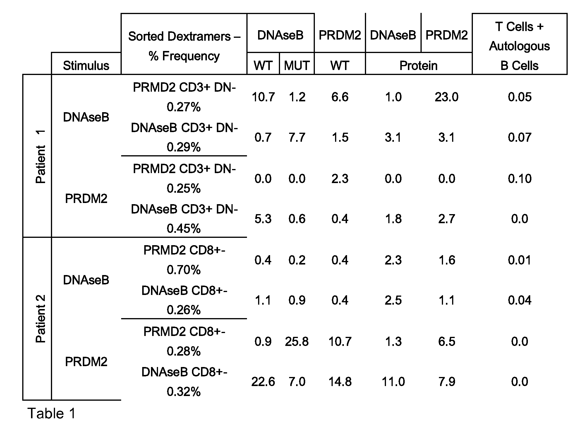 antigen and stimulating.. The cultured cells were tested for the T-cell phenotype on day 1 and day 18. Fig. 2 shows the flow cytometry results of these samples. In the results first the lymphocytes are filtered and then the CD3+ lymphocytes are filtered. These cells are then further analyzed for the presence of CD4 and CD8. From the panels it can be seen that after day 1 only 13 % of the cells are in the double negative state. The majority of the cells are CD4+. After 18 days of expansion with the cytokine cocktail 92 % of the cells are double negative cells (CD3+CD4-CD8-) T-cells. Furthermore, the induction of IFN-γ production of the expanded lymphocytes upon PRDM2 peptide stimulation is tested. As shown in Fig. 3 on day 1 only 0.89 % of the cells produce IFN-γ upon PRDM2 stimulation. In contrast, the sample from day 18 shows a significantly increased population of cytokine producing PRDM2 specific T-cells. As most of the T-cells are in the CD3+CD4-CD8- state, this shows that the expansion protocol leads to the formation of clinically relevant double negative T-cells. Example 6 - Sorted Dextramer cells produce IFN-γ in response to autologous EBV-LCLs loaded with peptide and protein antigens The expansion protocol according to Example 1 was carried out with blood from two different patients with narcolepsy again with PRDM2 as expansion peptide. In two different setups per patient either DNAseB or PRDM2 peptides were added to the cytokine cocktail in the culture medium. CD3+CD4-CD8- and conventional CD8+ T-cells that were MHC restricted and directed against PRDM2 or DNAseB were sorted by flow cytometry and tested whether they recognize naturally processed and presented epitopes. T-cells from the same patients were pulsed with peptides or with recombinant proteins and IFN-γ production was measured. The results of the experiment are summarized in Table 1 :