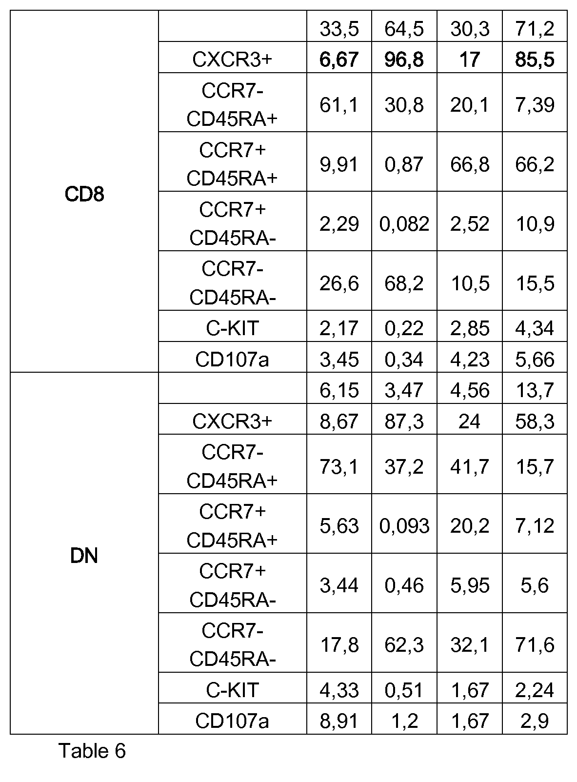 Again the lymphocytes are separated according to the presence of CD4 or CD8+. The numbers in the table refer to percentages of cells positive for the individual markers listed in the second column in the table at TO or after 18 days of expansion (Ag). Again for most patients a strong induction of 4-1 BB+ T-cells is found.