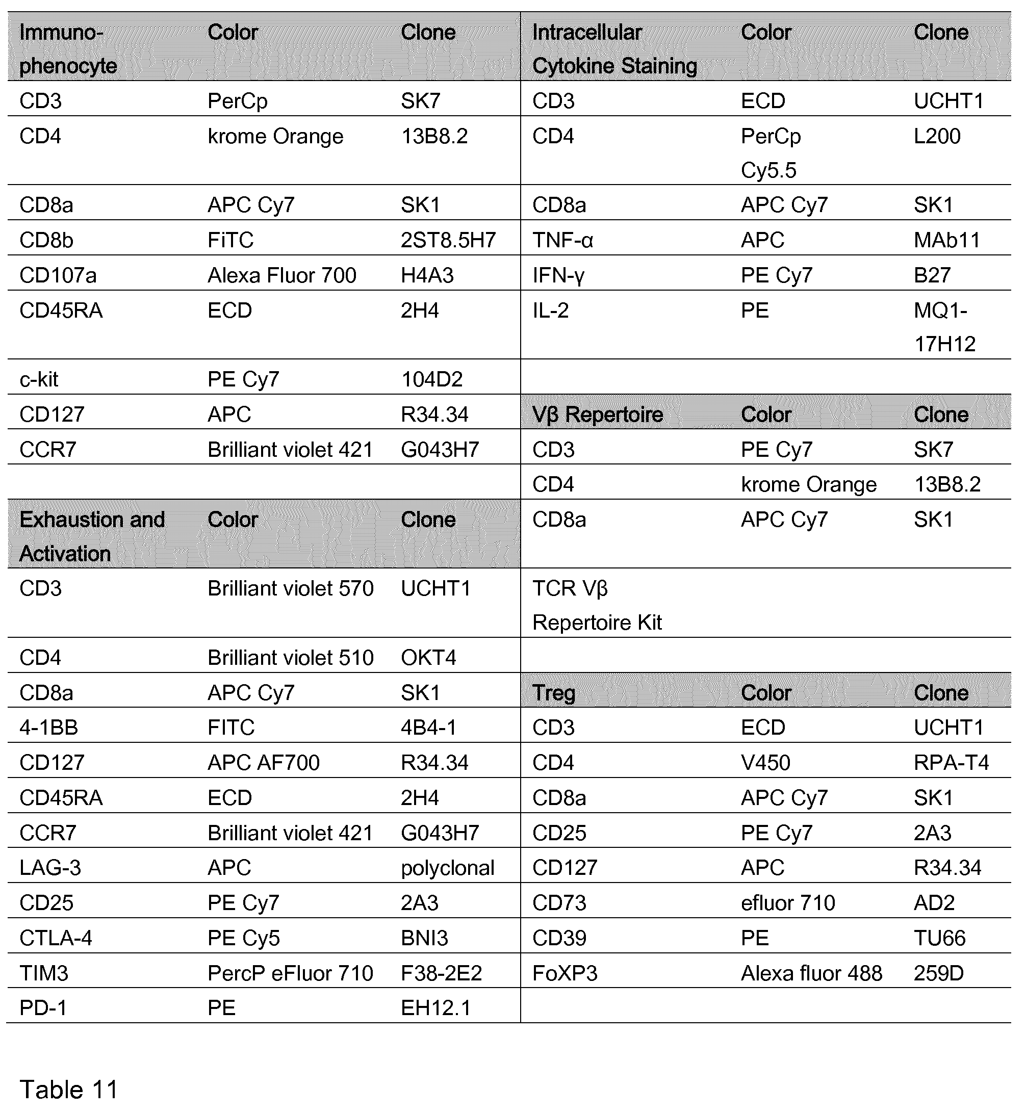 Table 10 The data show that TIL could be expanded from each individual tumor mainly contain CD3+ T-cells. Depending on the patient either one of CD4+, CD8+ and DN T-cell are in the majority. However, CD4+ was found most frequently in majority. The table also shows that the cytokine cocktail is able to expand T-cells from different CNS tumor histologies, (see column 4 "Diagnosis") B) The expanded cells were analyzed by flow cytometric analysis with regard to their specific phenotype - precursor (CD45RA+CCR7+), central memory (CD45RA- CCR7+), peripheral memory (CD45RA-CCR7-), or differentiated effector (CD45RA+CCR7-) T-cells and the expression of activation/exhaustion markers in the base phenotypes CD8+, CD4+ and double negative T-cells.