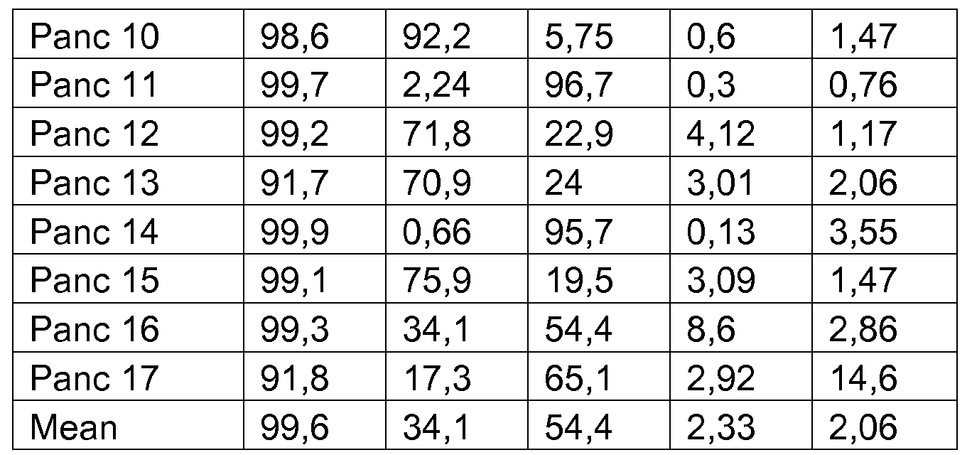 The data of Table 14 shows that individual TCR VB are preferentially expanded in TIL. It is noted that clonality can only be addressed by sequencing. It is noted that the cytokine cocktail expands different TCR νβ families in individual patients. This is true for patients with glioblastoma, as well as for patients with patients with pancreatic cancer. Note also that some TIL are composed for a single or two VB families showing a highly focused TCR VB expansion, suggestive of an antigen- driven T-cell expansion process. Some TIL that we have shown to be preferentially expanded were shown to be monoclonal. Thus, the cytokine cocktail of IL-2, IL-15 and IL-21 expands a focused T-cell response, that is directed against the patient's own tumor cells. Example 38 - Link of TCR usage in pancreatic cancer with recognition of autologous tumor cells Tumor tissue was obtained from pancreatic cancer patients. TILs were expanded from the tumor tissue with the cytokine cocktail of IL-2, IL-15 and IL-21 according to the protocol of Example 28. Cells were stained by flow cytometry using CD3, CD4 and CD8 in combination with a TCR νβ antibody. The panel that covers up to 75 % of the entire TCR VB repertoire. If certain T-cell families reside in the 25% that are not covered by this panel, they are not captured in this panel. The results are summarized in Table 15. Table 15
