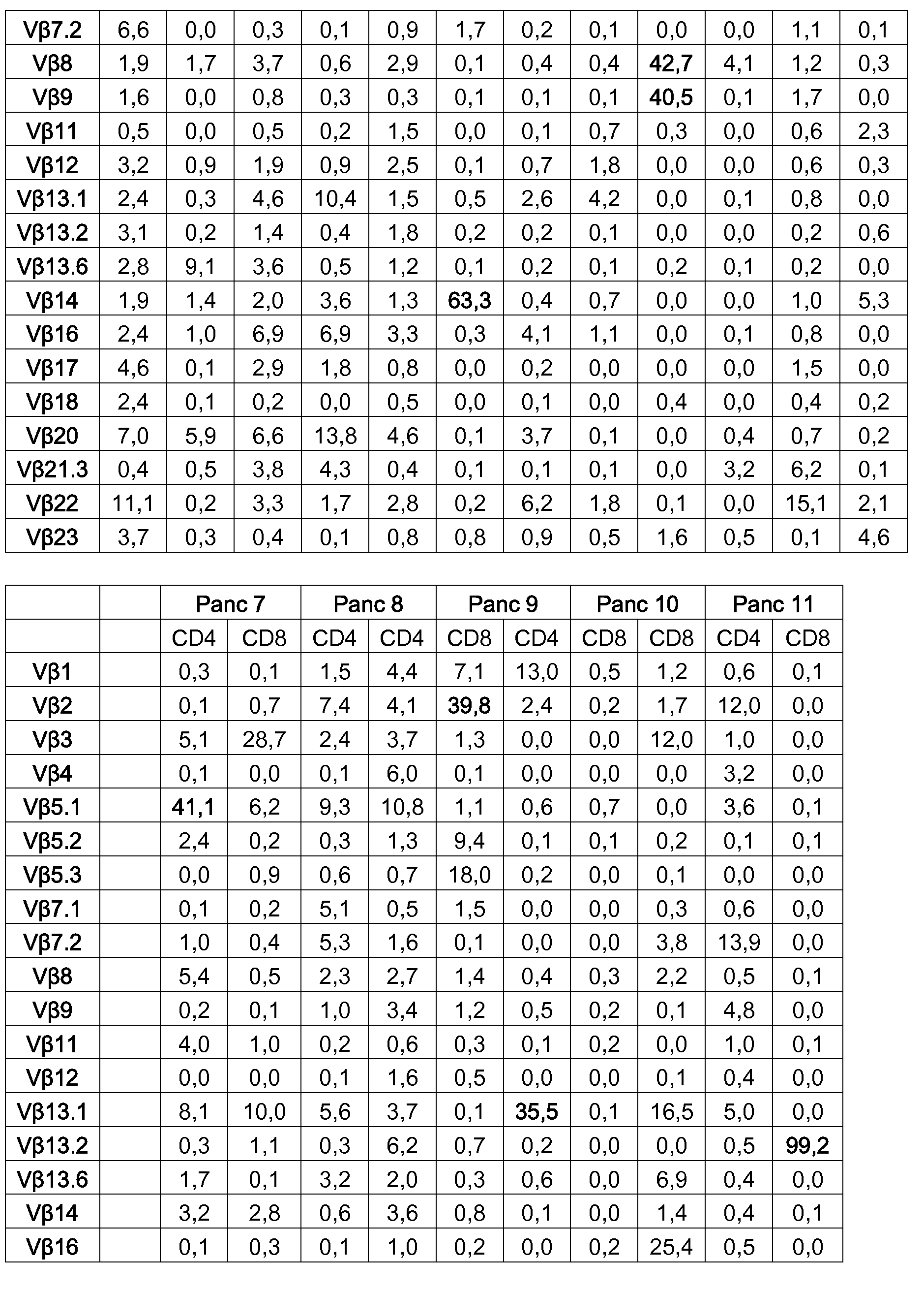Example 37: Link of TCR usage in pancreatic cancer with recognition of autologous tumor cells Tumor tissue was obtained from glioblastoma patients. TILs were expanded from the tumor tissue with the cytokine cocktail of IL-2, IL-15 and IL-21 according to the protocol of Example 27. The expanded lymphocytes were stimulated with autologous tumor cells. TIL were first gated on CD3+ T-cells, then on CD4+ and CD8+ T-cells. The frequency of individual νβ families were tested using a panel of TCR VB antibodies. This TCR panel covers about 75% of the human TCR repertoire, there is therefore a possibility that not all TCR νβ families are captured sufficiently. The TCR νβ family distribution is about 2 to 6 % in each family, except for TCR VB 2 that can reach over 10%. Table 14 shows the preferential expansion of the νβ-2 family in TIL from patients with glioblastoma.
