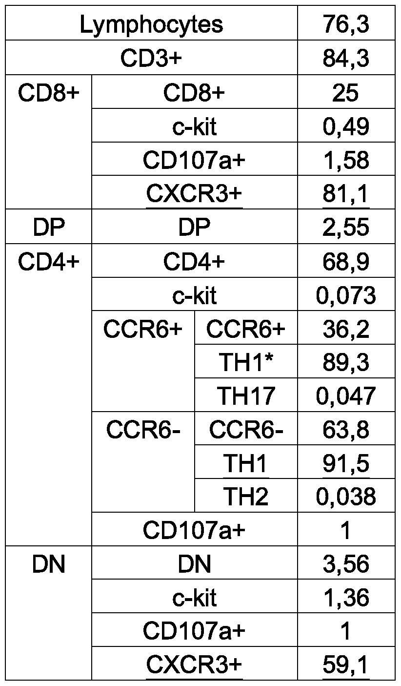 In addition the population of lymphocytes may comprise an increased number of T-cells that have recently been in contact with its antigen as for example identified by the 4-1 BB+ phenotype. According to one embodiment of the fourth aspect the percentage of 4-1 BB+ T-cells based on the total number of T-cells is at least 1 %, preferably at least 2 %, more preferably at least 2.5 %. According to one embodiment the percentage of CD107+ cells based on the total number of T-cells is at least 1 %, preferably at least 2 %, more preferably at least 2.5 %. CD1 17+ T- cells have been associated with long-term memory population. The CXCR3+ phenotype CD8+ T-cells is further associated with invasiveness into tissues and thus maybe in particular beneficial for immunotherapy against cancer. Further the population of lymphocytes may comprise sufficient percentage of CD3+CD4-CD8- cells. These double negative T-cells are highly specific for the antigen target as they are dependent of the co-receptor CD4+ or CD8+ and produce inflammatory cytokines. Thus, they are cytotoxic. According to one embodiment a population of lymphocytes comprises a percentage of CD3+CD4-CD8- cells based on the total number of T-cells of at least 1 %, preferably at least 3 %, more preferably at least 5 %. According to a further embodiment the percentage of gamma delta T-cells based on the total number of T-cells in a population of lymphocytes is at least 1 %, preferably at least 3 %, more preferably at least 5 %. Gamma delta T-cells have the effect that they recognize stressed cells, transformed cells, infected cells, e.g. CMV+ target cells. Gamma delta T-cells cross - recognize as well virally and transformed cells. According to one embodiment the population of lymphocytes comprises the following features: the percentage of Treg based on the total number of T cells is below 5 %, preferably below 3 %;- - the percentage of TH1-cells based on the total number of Thi-cells is at least 50 %, preferably at least 70 %, more preferably at least 80 %, the percentage of CXCR3+ T-cells based on the total number of CD8+ T-cells is at least 50 %, preferably at least 70 %, more preferably at least 80 %,