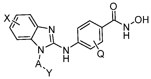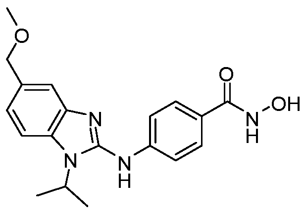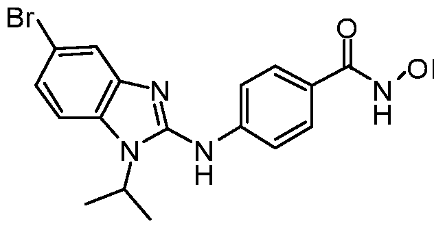 N-hydroxy-4-(l-(2-isopropoxyethyl)-lH-benzo[d]imidazol-2-ylamino)benzamide ID# 13 4-(5-(3 -fluorophenyl)- 1 -(2-methoxyethyl)- lH-benzo[d]imidazol-2-ylamino)-N- hydroxybenzamide ID# 14 4-(5-bromo-l-(2-(dimethylamino)ethyl)-lH-benzo[d]imidazol-2-ylamino)-N-hydroxybenzamide ID# 17 N-hydroxy-4-(l-isopropyl-5-(pyrimidin-5-yl)-lH-benzo[d]imidazol-2-ylamino)benzamide ID# 18 N-hydroxy-4-(l-isopropyl-5-(pyridin-3-yl)-lH-benzo[d]imidazol-2-ylamino)benzamide ID# 19