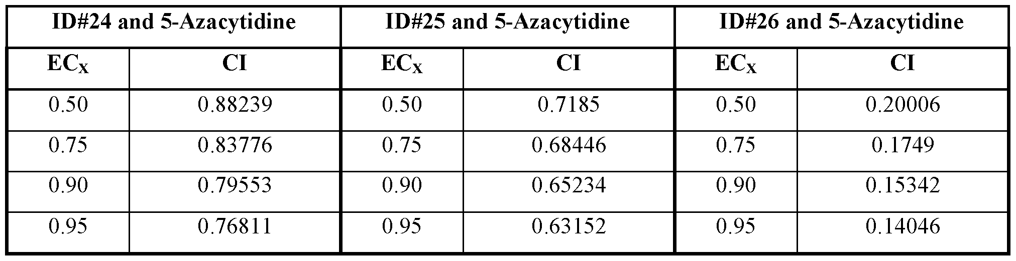 homogeneous method to determine the number of viable cells in culture based on quantitation of the ATP present, which signals the presence of metabolically active cells. Following treatment, CellTiter-Glo® is added to treatment wells and incubated at 37° C. luminescence values were measured at using a Molecular Devices Spectramax microplate reader. Single Agent Studies— Cells were grown to 70% confluency, trypsinized, counted, and 3 3 seeded in 96 well flat-bottom plates at a final concentration of 2.5x 10 -5x 10 cells/well (Day 0). Cells were allowed to incubate in growth media for 24 hours to allow for maximum adhesion. Treatment with the test agents or standard agents began on Day 1 and continued for 72 hours. At the 72-hour time point, treatment containing media was removed. Viable cell numbers are quantified by the CellTiter-Glo® cell viability assay as described above. Experiments were run with triplicate concentrations to determine growth inhibitory activity. Results from these studies were used to calculate an IC50 value (concentration of drug that inhibits cell growth by 50 percent of control) for each compound. Data Collection— For single agent and combination studies, data from each experiment was collected and expressed as % Cell Growth using the following calculation: % Cell Growth = ( fyehicie)x 100 Where ftest is the luminescence of the tested sample, and fvehicie is the luminescence of the vehicle in which the drug is dissolved. Dose response graphs and IC50 values were generated using Prism 6 software (GraphPad). Example 4: Synergism To test for synergy between the benzamide compound and DNA methyltransferase inhibitors, the IC50 of different benzamide compound of the invention in combination with 5- azacytidine against HL-60 cells was evaluated. For each experiment, the CI value at the ED50, ED75, ED90 and ED95 (dose of drug combination that produces an effect, e.g. reduction of cell proliferation of 50%, 75%, 90% and 95%)) was calculated for drug combination. The synergism factors (CI values) for the various combinations are summarized in Table 3 below. The CI values have been calculated using the program CompuSyn (CompuSyn, Paramus, N.J.). The CI values were < 0.90, showing synergy between the benzamide compound and a DNA methyltransferase inhibitor.
