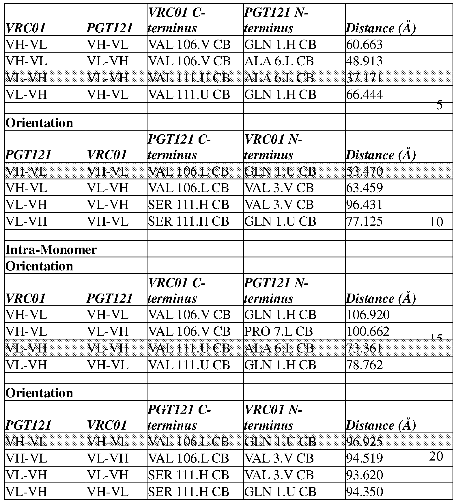 ions were examine d (Table 10 2, shown below). Table 2 shows a summary 15 of distances between the termini 20 of PGT121 and VRCOl when 25 bound to JR-FL SOSIP.6 64 trimer (inter-monomer and intra monomer) inspected by Chimera, based on antibody- trimer complex structure (PDB: 5FYK). PGT122 serves as a surrogate for PGT121. Table 2