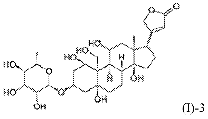[00071] 3. Use of active compounds [00072] According to the present invention, a cardiac glycoside can be used to induce cell death of undifferentiated pluripotent stem cells and therefore can selectively remove undifferentiated pluripotent stem cells from differentiated cells. [00073] In particular, the present invention provides a method for removing undifferentiated pluripotent stem cells from a sample comprising said cells, comprising exposing said sample to an effective amount of a cardiac glycoside. [00074] In some embodiments, the sample is a cell sample that comprises cells in culture (in vitro) that is to be transferred to a patient in need of cell therapy. [00075] In particular, the present invention also provides a method for preparing differentiated cells, comprising (i) subjecting undifferentiated pluripotent stem cells to a condition suitable for differentiation to produce a cell population that comprises differentiated cells and undifferentiated pluripotent stem cells; (ii) removing the undifferentiated pluripotent stem cells by exposing the cell population to an effective amount of a cardiac glycoside; and (iii) optionally culturing the remaining differentiated cells. [00076] In some embodiments, undifferentiated pluripotent stem cells are selected from the group consisting of embryonic stem cells (ESCs) and induced pluripotent stem cells (IPSCs). Preferably, the pluripotent stem cells are sourced from humans. Human ESCs can be obtained from human blastocyst cells using the techniques known in the art. Hunan IPSCs can be prepared by isolating and culturing suitable somatic donor cells, for example, human fibroblasts, and subjected to genetic engineering using techniques known in the art. [00077] In some embodiments, undifferentiated pluripotent stem cells are cultured in a culture medium under condition which allows a proportion of the undifferentiated pluripotent stem cells to differentiate into differentiated cells of interest, then an effective amount of a cardiac glycoside is added to the culture medium to cause cell death of residual undifferentiated pluripotent stem cells, and optionally the remaining differentiated cells are further cultured for expansion which are then administrated to a subject in need of cell therapy. [00078] In some embodiments, the culture medium suitable for culturing undifferentiated