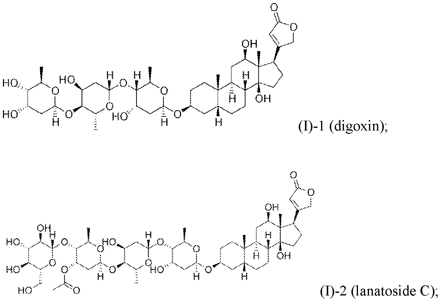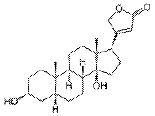 different lots (cytotoxic antibodies and specific antibody cell sorting) ' , non-specific binding (cytotoxic antibodies)18"20, requirement of genetic manipulation and stable integration of toxic genes (genetic manipulation), and time-consuming procedures (genetic manipulation, specific antibody cell sorting and cytotoxic antibodies). Although many studies have attempted to prevent or block teratoma formation in residual hPSCs, a clinically applicable strategy to eliminate teratoma formation remains to be developed2 21. [0005] In contrast, small molecule approaches have several advantages as follows: these approaches are robust, efficient, fast, simple, and inexpensive, and there is no need to insert genes into cells. Certain small molecules have been shown to inhibit teratoma formation in hPSCs. The inhibitor of stearoyl-CoA desaturase PluriSin #1 prevented teratoma formation15. Stearoyl-CoA desaturase is a key enzyme in the biosynthesis of mono-saturated fatty acids and is required for hPSC survival15. The N-benzylnonanamide JC011 induced ER stress through the PERK/AT4/DDIT3 pathway22. Chemical inhibitors of survivin, such as quercetin and YM155, induced selective cell death and efficiently inhibited teratoma formation14. However, neither of these drugs is well defined or approved by the FDA. [0006] Cardiac glycosides (CGs) (also named cardiotonic steroids, CSs) belong to a large family of compounds that can be derived from nature products. Although these compounds have diverse structures, they share a common structural motif. These compounds are specific inhibitors of the transmembrane sodium pump (Na+/K+-ATPase). CGs inhibit the Na+/K+-ATPase and then increase the intracellular concentrations of calcium ions23. These compounds act as positive inotropic agents, and members of this group have been used in the treatment of heart failure for more than 200 years. One member of this family, digoxin, is still in clinical use24. Furthermore, CGs are currently considered to have a potential therapeutic role in cancer therapy25. Several studies have reported that CGs play important roles in inducing cell death in several cancer cells23. Cancer cells show more susceptibility than cells in normal tissues. The molecular mechanism may be the overexpression of specific alpha subunits of Na+/K+-ATPase in cancerous cells26. These studies indicate that CGs are selective according to the cell type and distinguish between normal cells and transformed cells. [0007] Although cardiac glycosides act as multiple signal transducers, no studies have investigated whether these drugs can eliminate undifferentiated PSCs while sparing their progeny or differentiated cells.