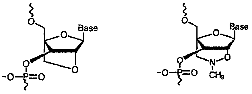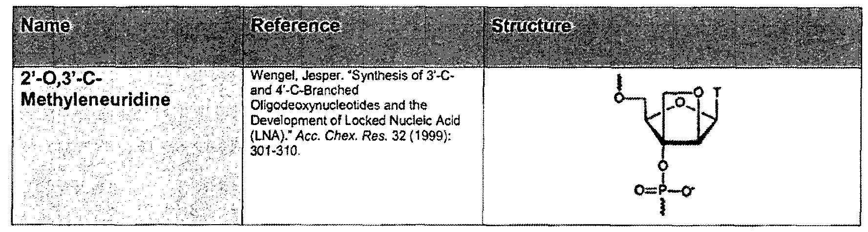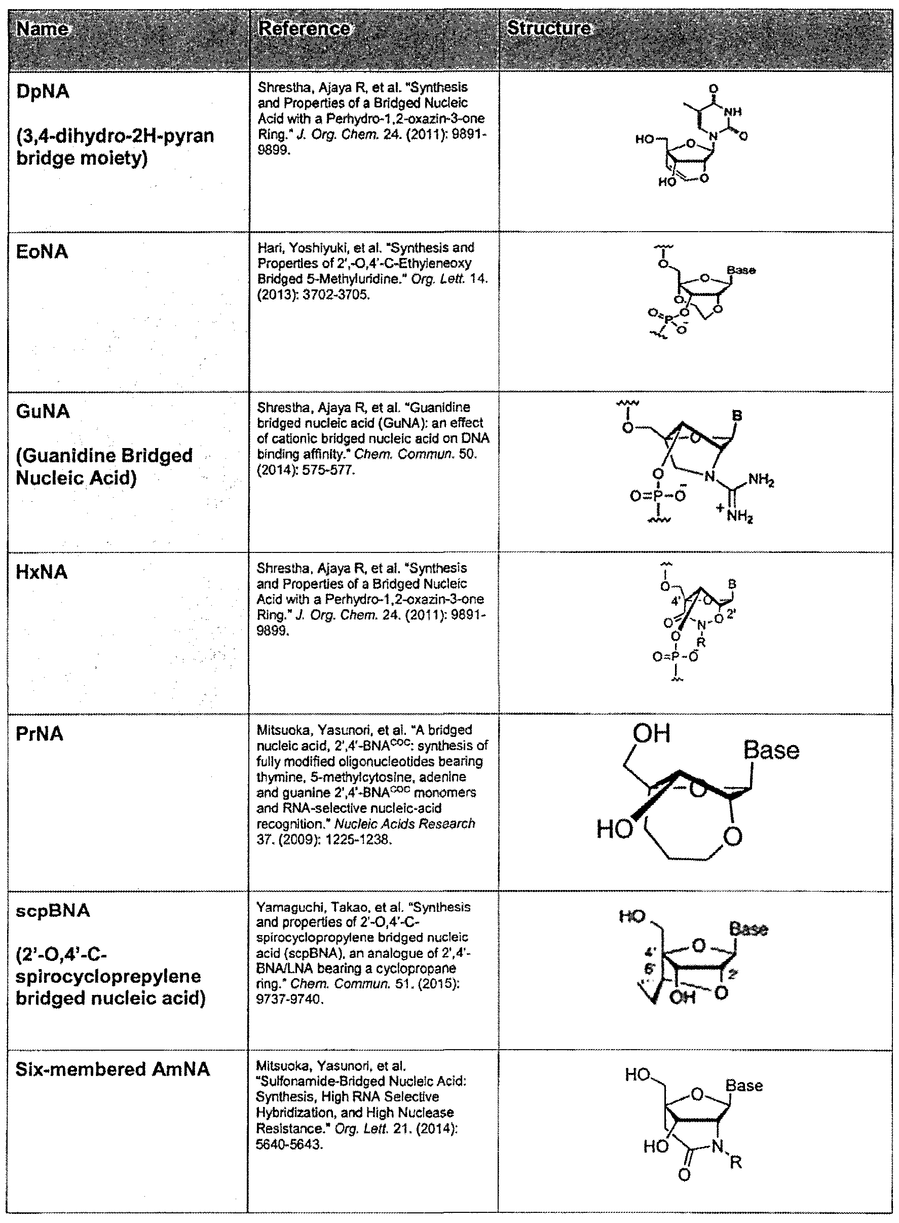 efiget et al. or another bridged nucleic acid described in Takeshi Imanishi and Satoshi Obika, "BNAs: novel nucleic acid analogs with a bridged sugar moiety" Chemical Communications 2002 (Issue 16). [0099] In some embodiments, the bridged nucleic acid is a 2',4'-bridged nucleic acid - i.e. the bridged nucleic acid comprises a bridge incorporated at the 2 -, 4'-position of the sugar ring. A number of the bridged nucleic acids appearing in Table 1 above include a bridge incorporated at the 2 -, 4'-position of the sugar ring. [00100] As noted above, bridged nucleic acids can be obtained from commercial sources. For example, BioSynthesis Inc. is a commercial source of bridged nucleic acids and has published a number of known 2',4'-bridged nucleic acids, as shown below;