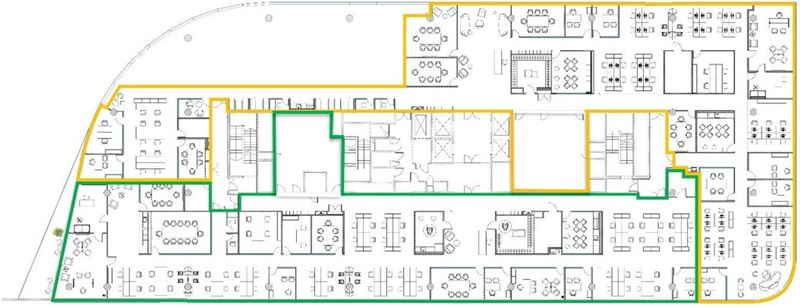 Предлагается в аренду офисное помещение общей площадью 1232 кв.м., расположенное в деловом квартале "Сколково Парк", корпусе 3. На схеме отмечено желтым цветом.